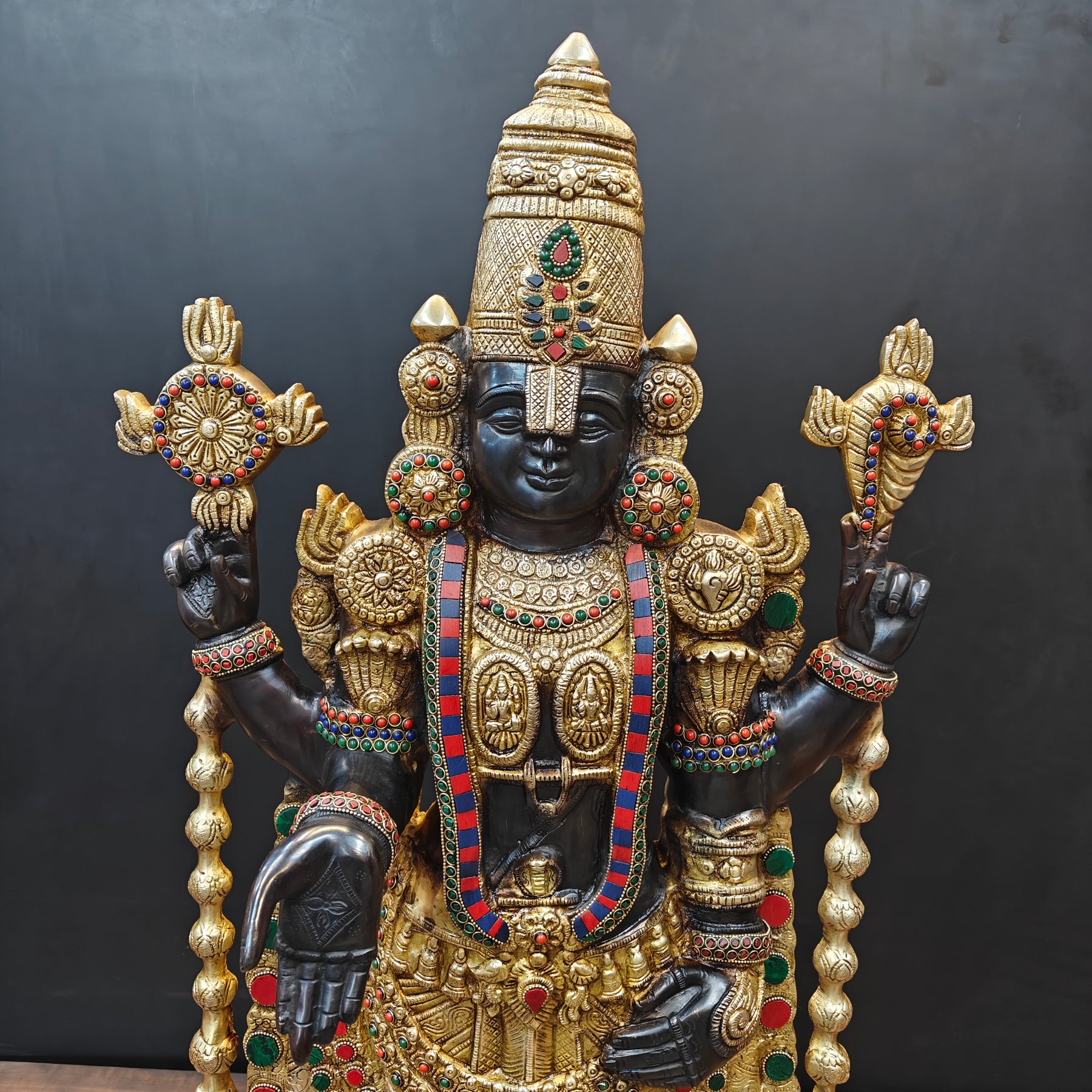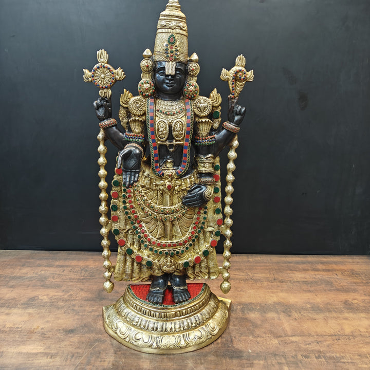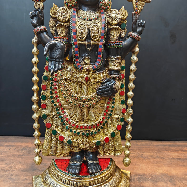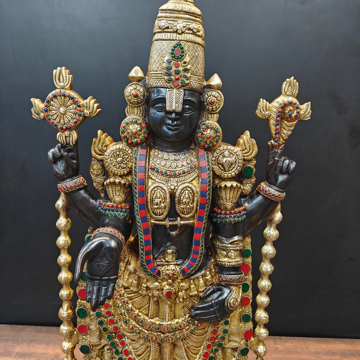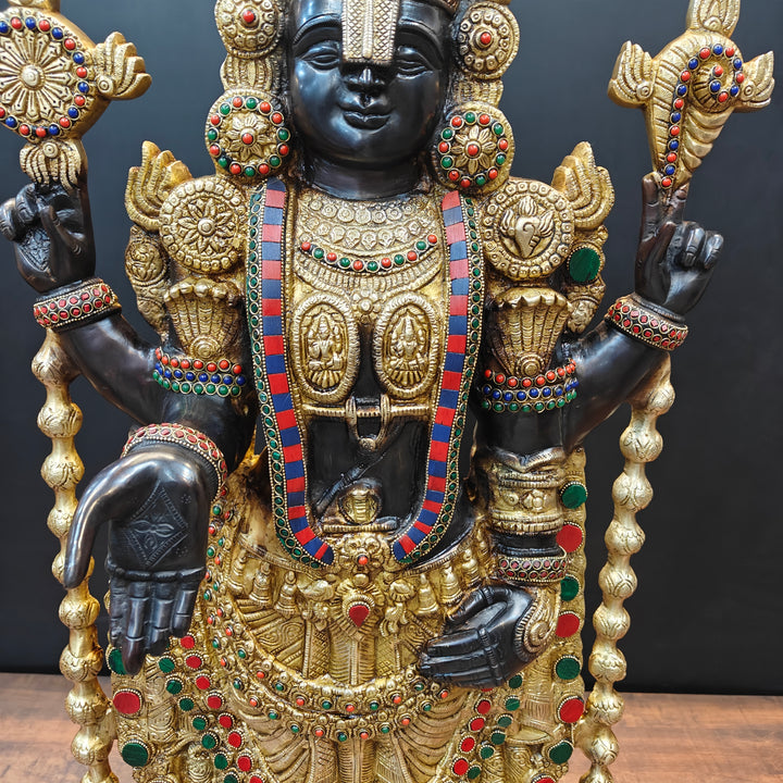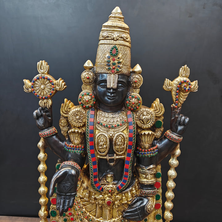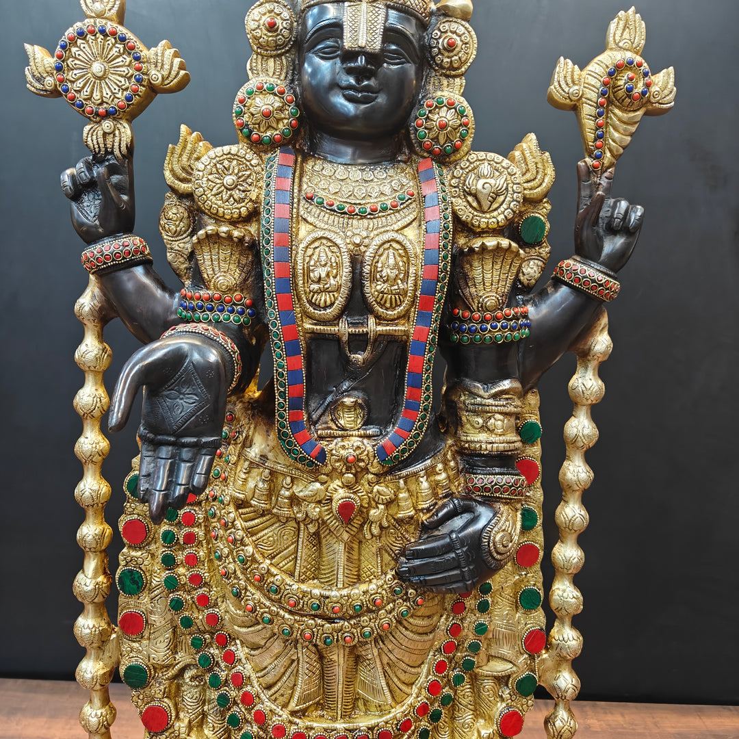 The pious deity of Tirupati placed inside the temple is known by the name of Venkateswara in south India. The sacred deity of Balaji is black in color which is said to be self-transformed into the stone, hence, equipped with supreme powers. The deity is in standing posture facing the east. There are two imprints on the chest of Balaji representing Lakshmi and Padmavati. The white mark on the forehead is too long that covers the eyes and only a small part is visible.