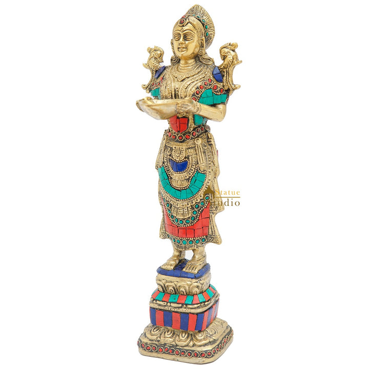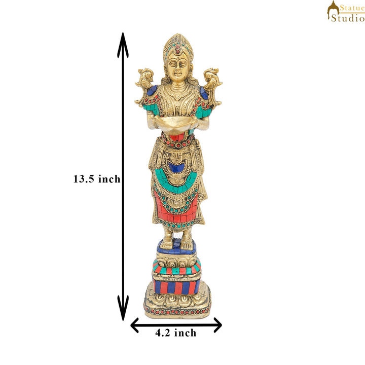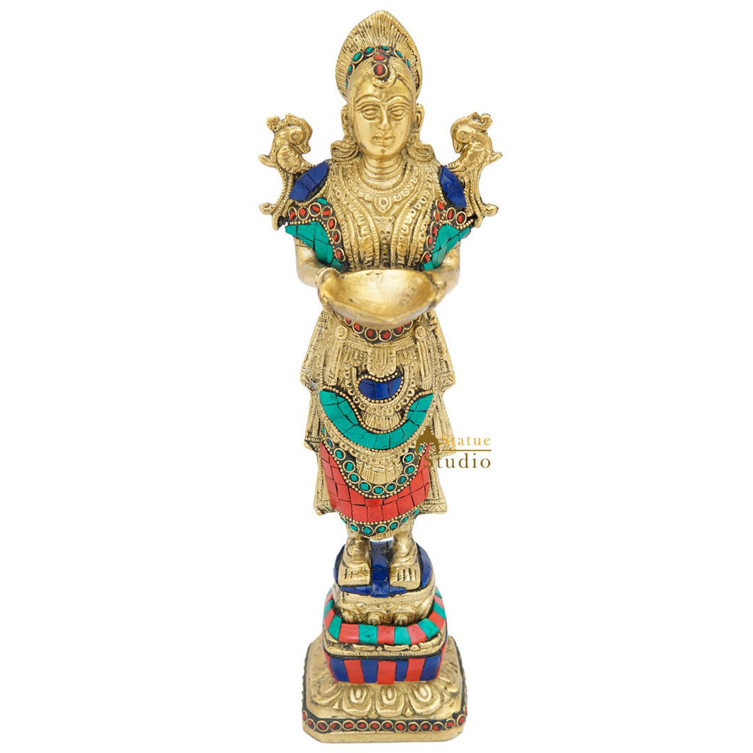 Deeplakshmi is the celestial lady holding brass lamp with a depiction of goddess Laxmi. Deeplakshmi is commonly used in a Hindu temple as well as a home décor. They are made of metal, a tall brass, or bronze lamp on a stand where the wicks are placed at a certain height. A lady can be seen holding a vessel or lamp in their hands. This type of lamp comes in different shapes and sizes. Its mainly used in décor of Entrance doors or big living rooms or can be used to adorn pooja rooms with one of your most worshipped deity. Welcome Lady represents the goddess Lakshmi standing with deep and gives wealth and good fortune.