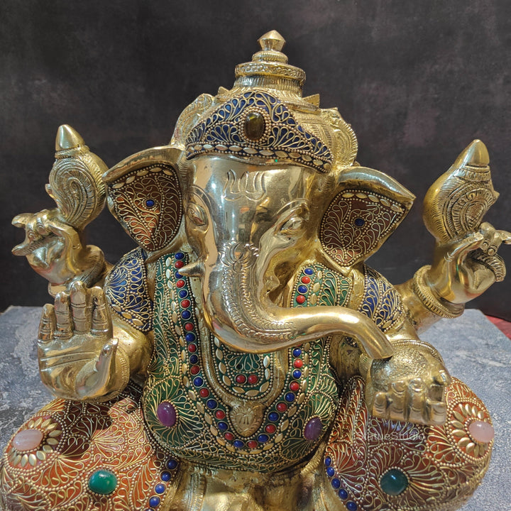 Brass Handcrafted Aashirwad Ganapati Idol With Stone Work 14 Inches