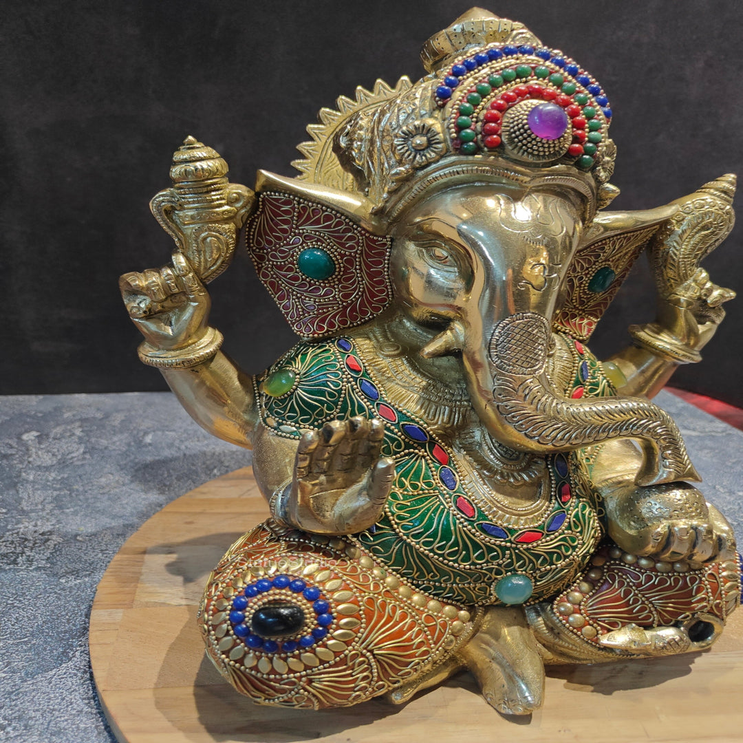 Brass Taj Ganesha Statue With Stone Work 1 Feet