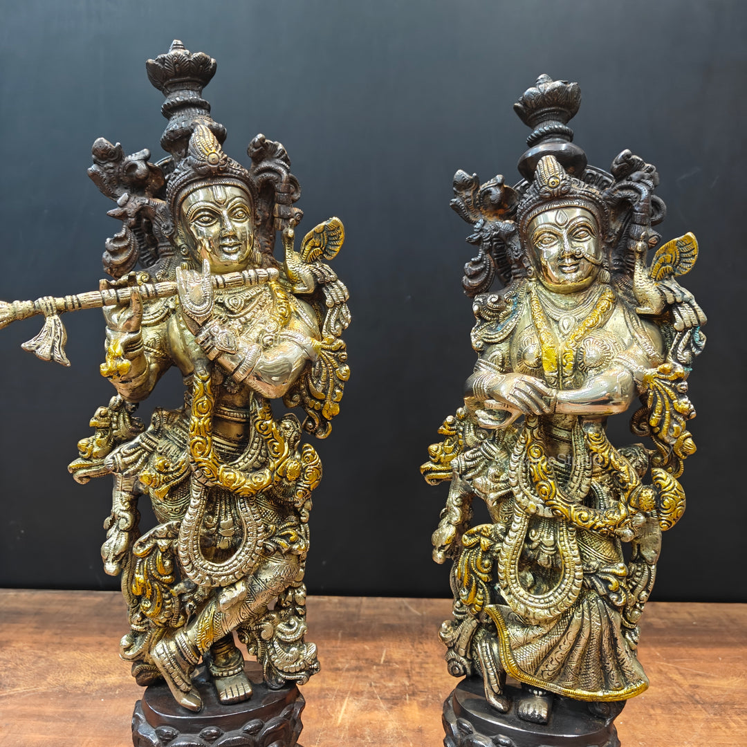 Gopi & Gopal - Radha is believed to be the incarnation of Goddess Laxmi - the Goddess of Wealth. Gopi (milkmaid) is a common name attributed to the girls/women who along with their cow herds were attracted to Lord Krishna during his young age because of his flute and mannerisms. Radha was one of those Gopi, believed to be the closest to Lord Krishna. It is believed that both were having eternal love for each other but never got married. Yet their love for each other was so great and iconic that today in every part of the world Lord Krishna is worshipped along with Radha in temples as a sign of true love, hence the name Gopi & Gopal for these brass sculptures.