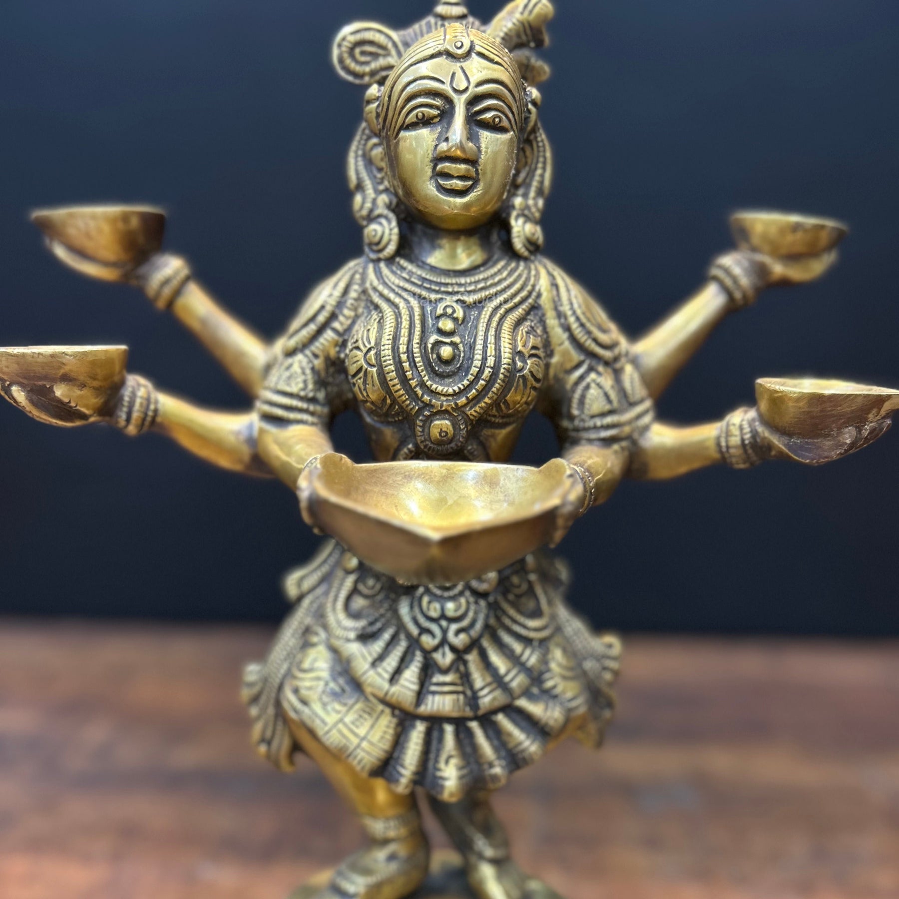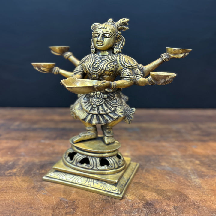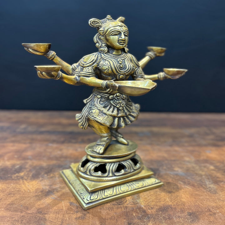 Deepluxmi. This is a statue of a lady holding an oil lamp. This posture is considered to be the best one for welcoming a guest to your place. When lit the oil lamp signifies the happiness and light that fills the heart of the hosts. Also it means that the host wishes that the path of his guests be always filled with light meaning prosperity in all kinds. Presence of light is considered the best positivity in one’s life. As said - Let there be Light, and there was light. This Brass lady oil lamp is a perfect choice for the entrances of your home, reception area at offices, shops/showrooms to welcome your guests. This sculpture has been made up using primarily brass metal.
