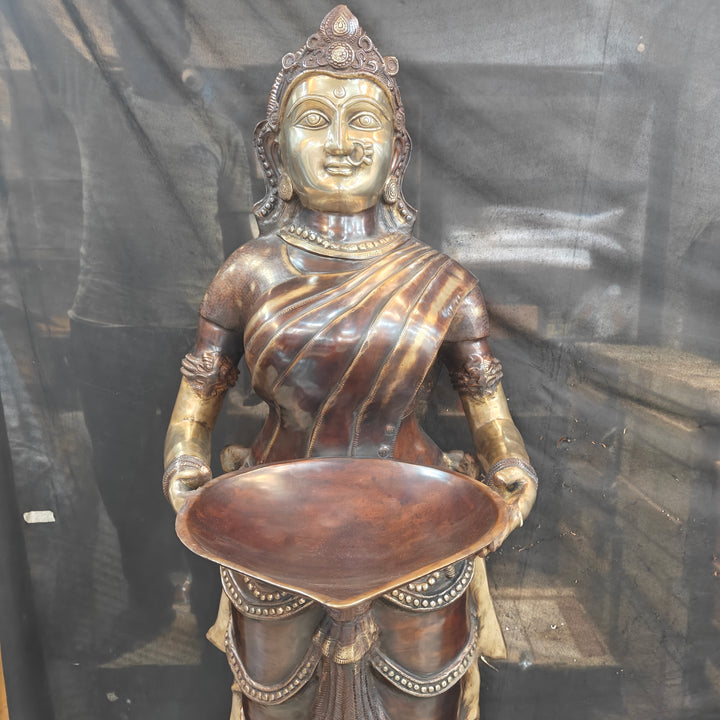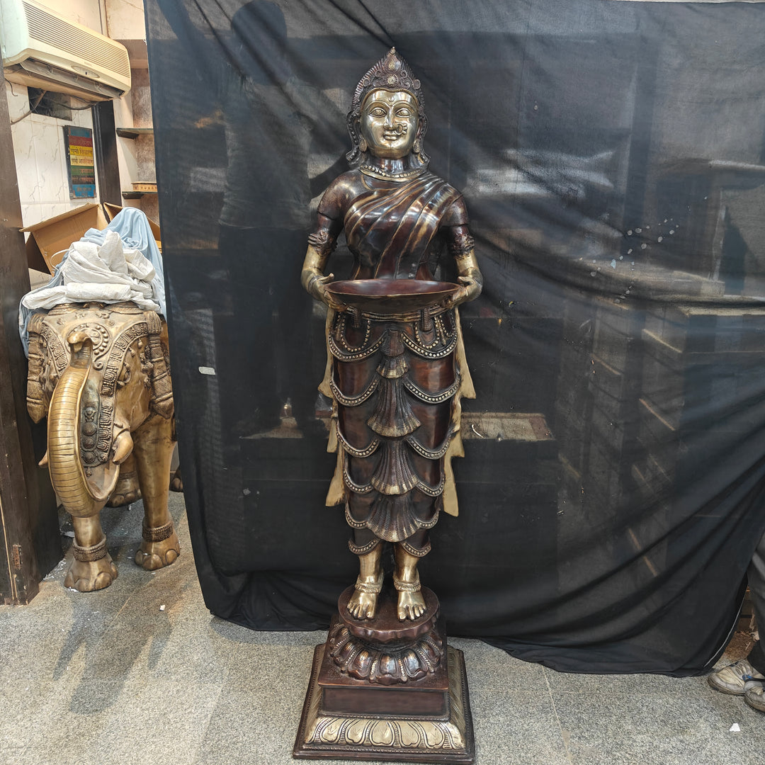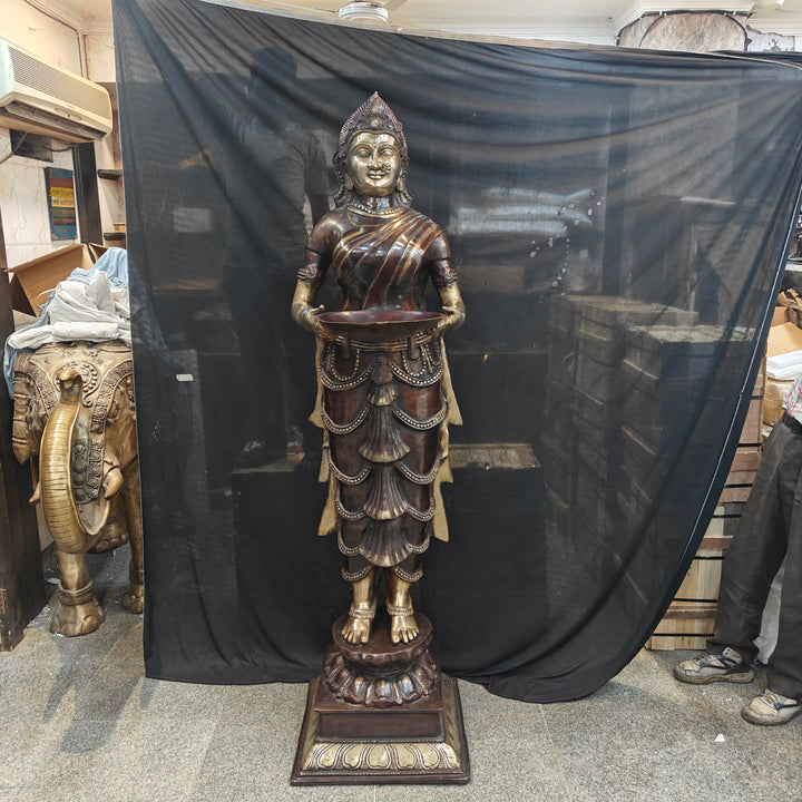 Deeplakshmi is the celestial lady holding brass lamp with a depiction of goddess Laxmi. Deeplakshmi is commonly used in a Hindu temple as well as a home décor. They are made of metal, a tall brass, or bronze lamp on a stand where the wicks are placed at a certain height. A lady can be seen holding a vessel or lamp in their hands. This type of lamp comes in different shapes and sizes. Its mainly used in décor of Entrance doors or big living rooms or can be used to adorn pooja rooms with one of your most worshipped deity. Welcome Lady represents the goddess Lakshmi standing with deep and gives wealth and good fortune.