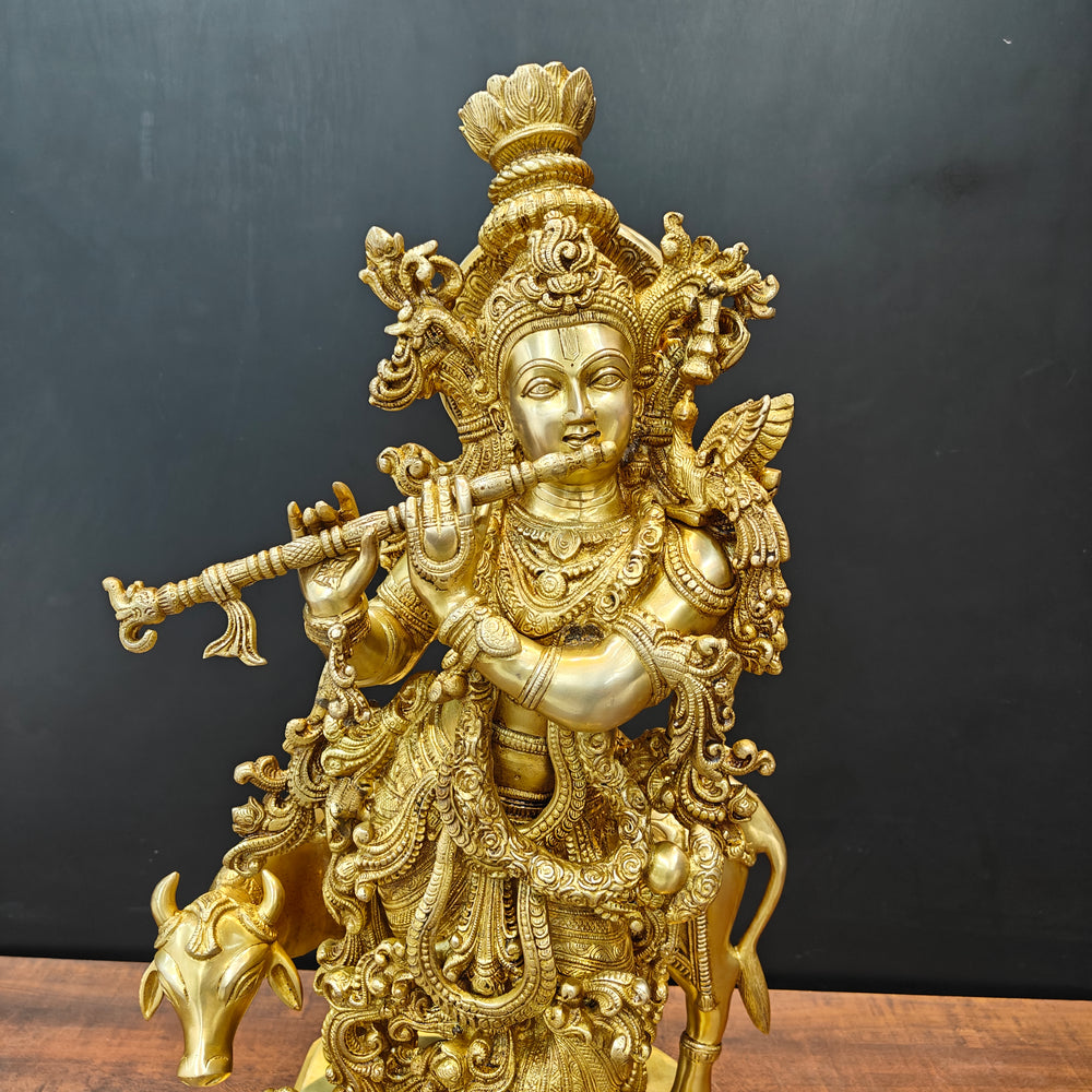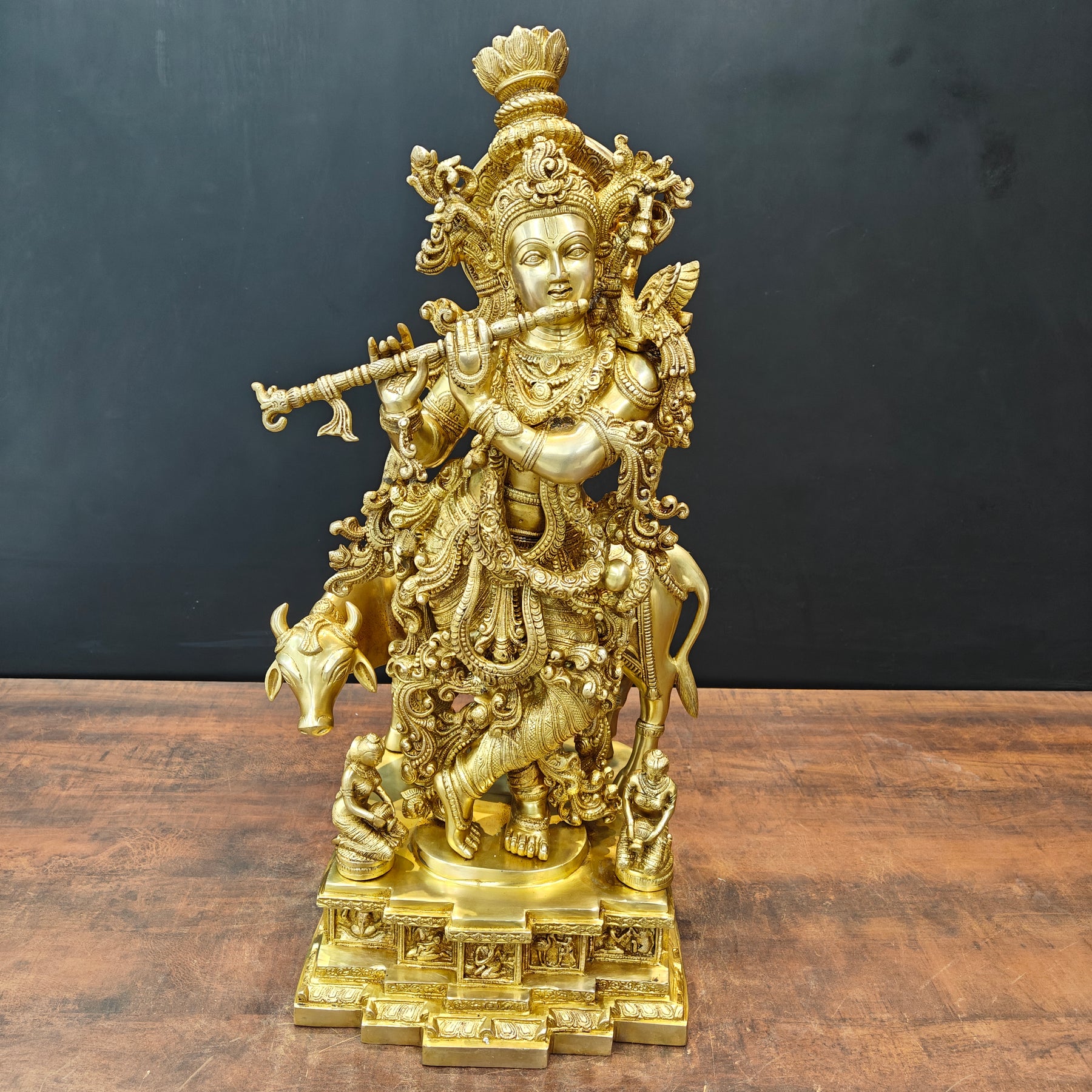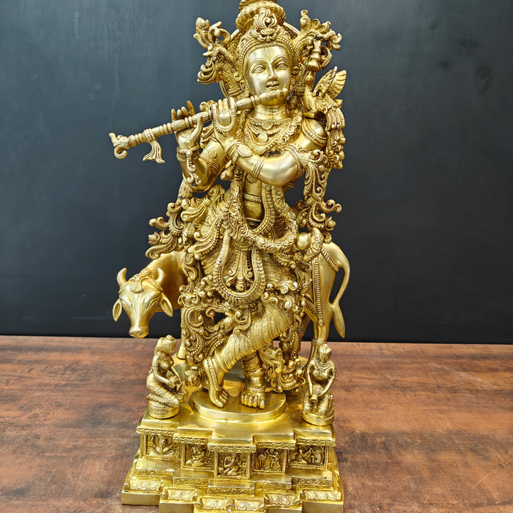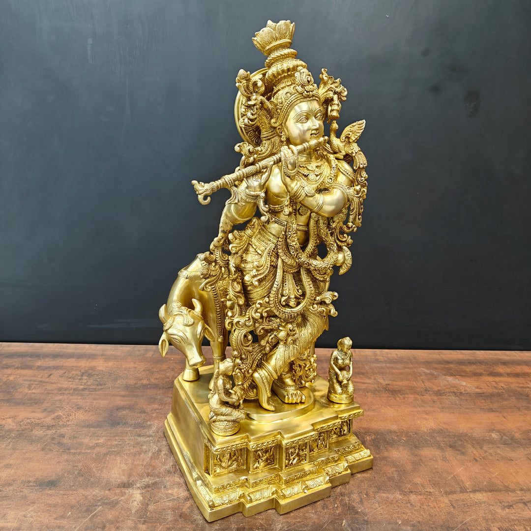 Brass Large Krishna Idol With Cow On Pedestal Gold Finish 28 Inch