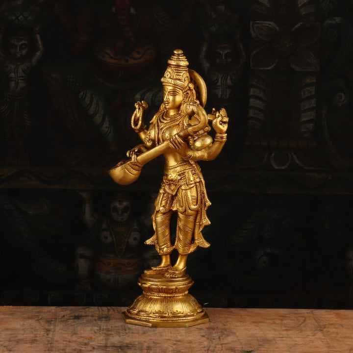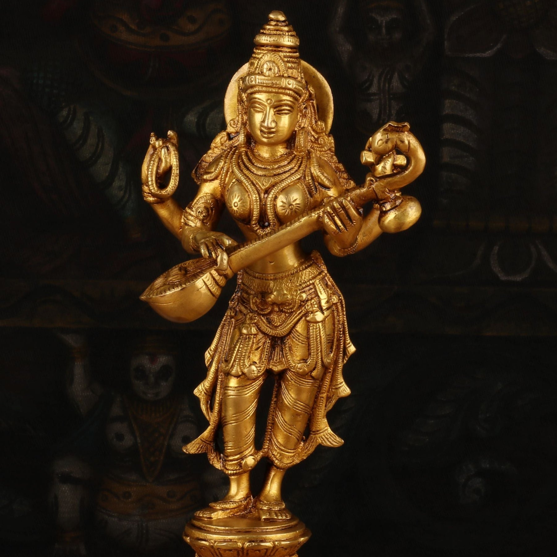 This Standing Saraswati Idol embodies knowledge, music, and the arts, inviting wisdom and creative brilliance into your learning space or home.
