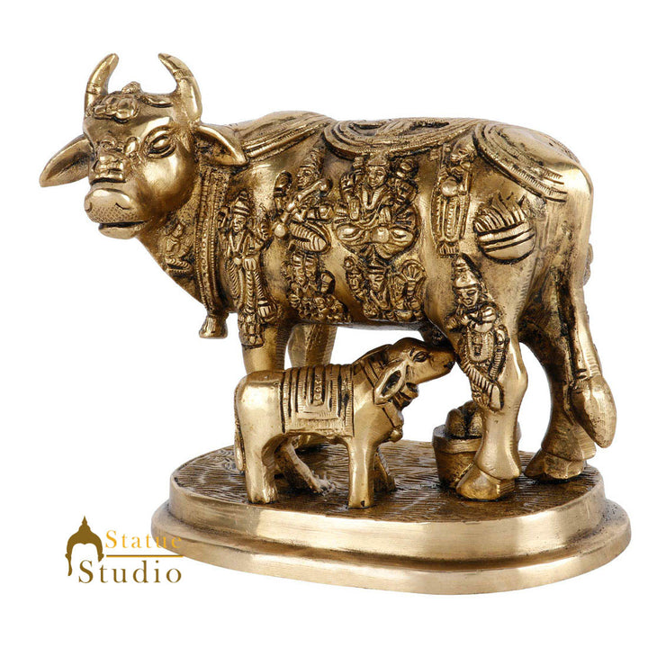 In India a cow is believed to be the holiest animal and is worshipped by Hindus and others. It is considered pious and is well fed, bred and served. Cows are regarded as a mother and hence called 'Gau-Mata' which literally means 'Cow Mother'. This brass statue depicts the soul of a nation called India, a mother feeding her child, a calf. It cannot get more emotional and compassionate than this. It shows and strengthens the feeling of love, care and motherhood. People place such statues and pictures near by 'would-be moms' to enhance their feelings of motherhood. No explanations needed, sometime feelings get the job done.