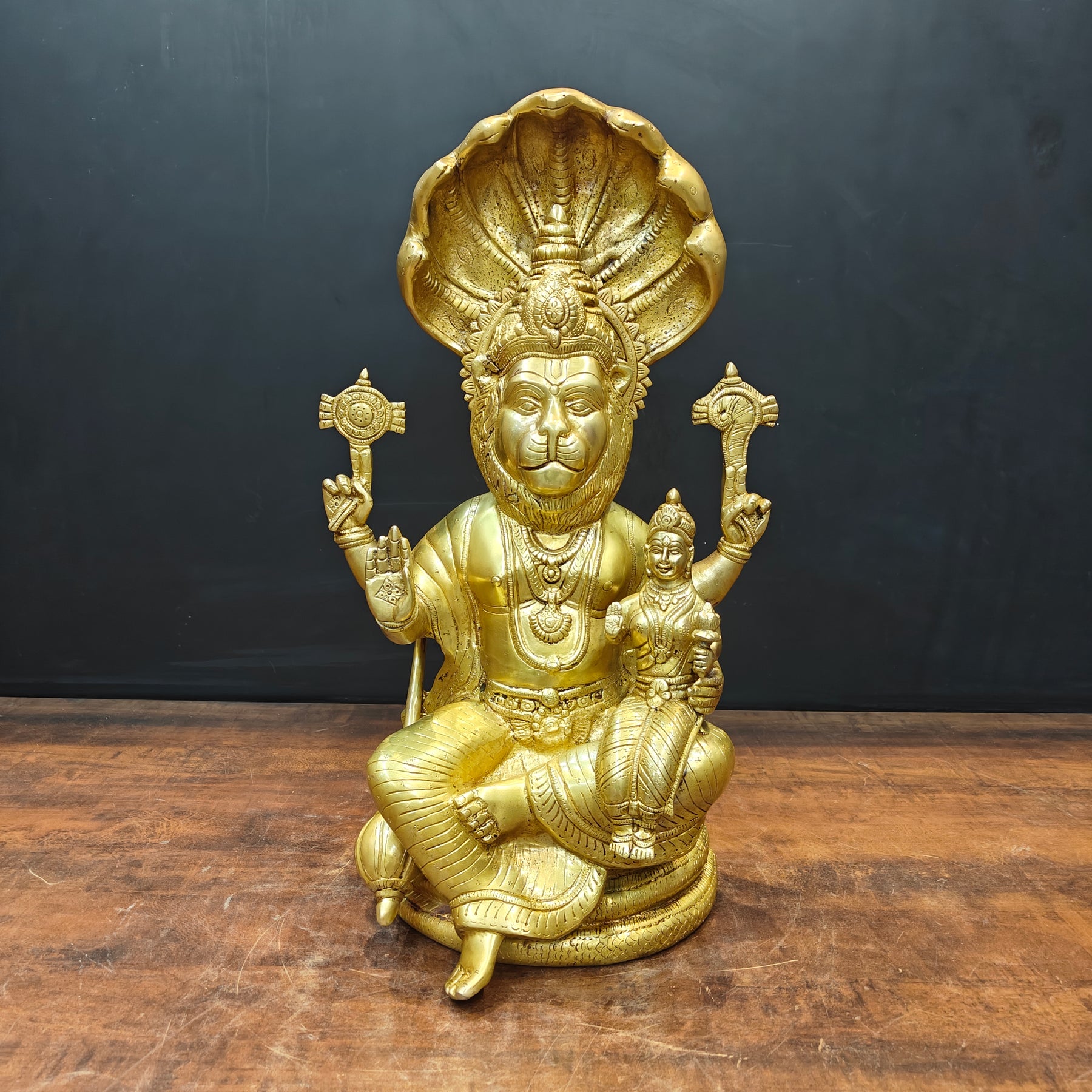 Narasimha Lakshmi - This brass sculpture shows Boar faced incarnation of Lord Vishnu known as Narasimha (Boar). It is beleived that Narasimha killed a demon called Hiranyaksha and freed the Goddess Earth or Lakshmi from him from the underwaters where snakes guarded the Earth for the demon. The hooded snake under the left feet of Lord Narasimha denotes that he controls them and had no fear of them. The freed goddess is seen sitting on his elbow. Another explanation of the statue is that Goddess Earth is a form of Goddess Lakshmi, who is consort of Lord Vishnu (in this case Narasimha, the boar) meaning Narasimha is having his consort Lakshmi on his elbow. In few statues Narasimha is shown having a globe resting on his tusks that symbolizes that he freed the Goddess Earth and lifted her on his tusks to place her back in the Universe.
