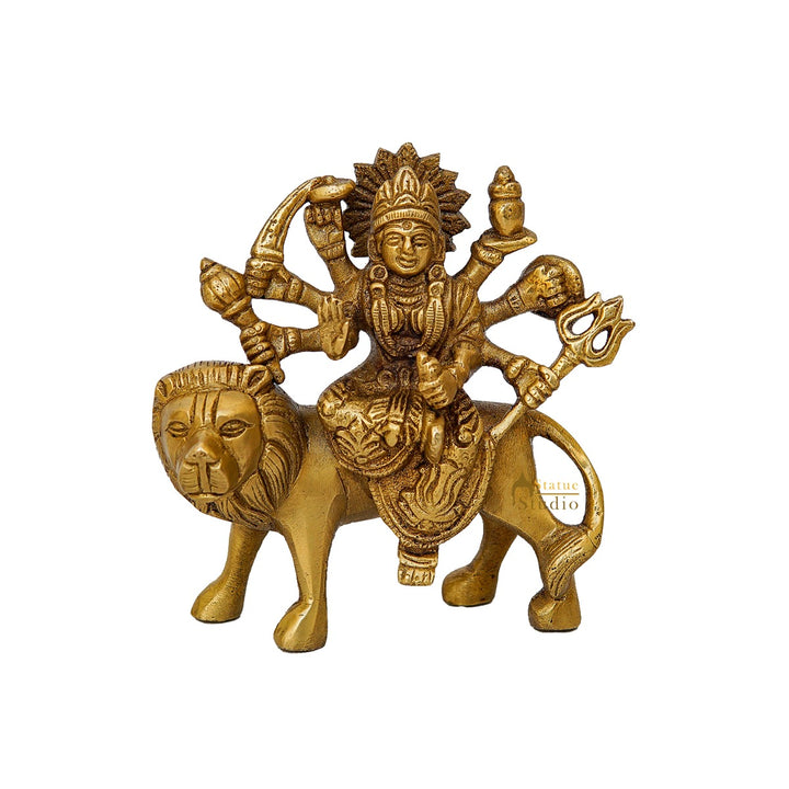 The very beautiful deity of Maa Durga represents her sitting on a lion-her vehicle, elegantly dressed up in a red saree. She wears a precious crown and is loaded with treasured jewelry all over. The majestic eight hands speaks of her great strength and power possessed by her. Each of the eight hands carries a weapon to kill the demons. She often appears in action on lion in most of the images, icons or idols killing the demon Mahishasura with buffalo. Maa Durga though in action does not imparts violence or hatred but love, care and compassion for the ones dependent on her.