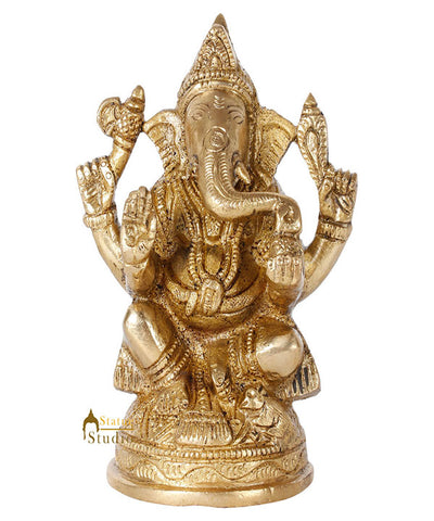 Chaturbhuj Shree Ganesha – The Hindi word ‘Chaturbhuj’ means the one who has four hands. In this brass sculpture and posture Lord Ganesha is depicted with his four hands. The upper right hand has a ‘Pharsa’ or an axe symbolizing cutting attachment bonds. The lower right hand is raised with palm facing outwards away from the body with fingers flexed. This hand gesture is called ‘Abhayamudra’ that offers protection for all from all evils. The upper left hand is shown holding a conch, ‘Shankha’ in Hindi. The sound of the conch is considered pious in Hinduism and represents the call to come and pray. The lower left hand holds a special sweet called ‘Modak or Laddoo’. It is believed that it is the favorite sweet of Lord Ganesha, also it represents the sweet result of prayers one offers and the sweetest things of all - The liberation or ‘Moksha’.