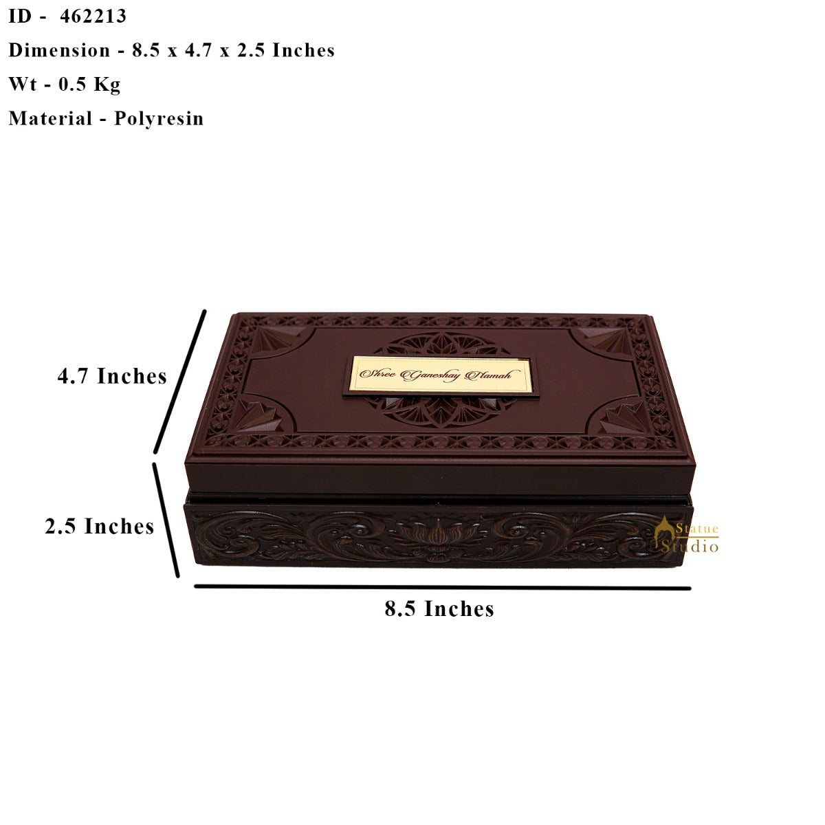 - Product Details : Product Code - 462213 || Width x Depth (Inches) - 4.7 x 8.5 Inches || Height (Inches) - 2.5 Inches || Weight (In Kg) - 0.5 Kg || Material - Brass || Made In India