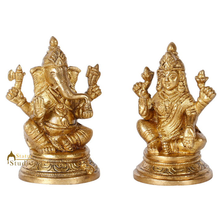 Lakshmi Ganesha – The Hindi word ‘Chaturbhuj’ means the one who has four hands. In this brass sculpture Lord Ganesha is depicted with his four hands. The upper left hand has a ‘Pharsa’ or an axe symbolizing cutting attachment bonds. The lower right hand is raised with palm facing outwards away from the body with fingers flexed. This hand gesture is called ‘Abhayamudra’ that offers protection for all from all evils. The upper right hand is shown holding a conch, ‘Shankha’ in Hindi. The sound of the conch is considered pious in Hinduism and represents the call to come and pray. The lower left hand holds a special sweet called ‘Modak or Laddoo’. It is believed that it is the favorite sweet of Lord Ganesha, also it represents the sweet result of prayers one offers and the sweetest things of all - The liberation or ‘Moksha’. Lakshmi is the Hindu goddess of wealth/money, prosperity, and fortune. Also she is the spouse of Lord Vishnu, who is believed to be the supreme savior of this universe. It is believed that worshipping goddess Lakshami brings good luck, removes misery and poverty. Lakshmi is worshipped in Hinduism in homes and also at commercial establishments as the goddess of wealth for their success. The festival of Diwali in India sees special prayers in homes, commercial places and temples of goddess Lakshmi with Lord Ganesha. She also enjoys worship as the consort of Vishnu in many temples.